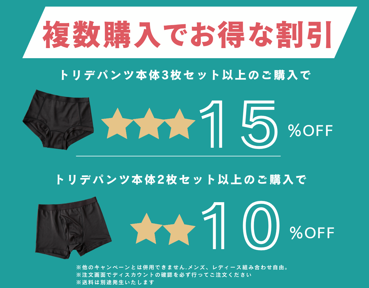 いつもToride-shopをご利用いただき誠にありがとうございます。 Toride-pantsはこれまでたくさんのお客様に着用いただいてきました。実は、圧倒的に女性の方にご着用いております。 先日、とある男性よりナーバスなご相談をいただきました。これまで男性の方にしっかりアプローチできていなかったことに気付き反省 そこで、急遽ではありますが、下記の期間でメンズトライアルセールを開催します! セール:メンズトライアルセール期間:2025年11/7(金)~24日(月・祝)対象:メンズパンツ1着 通常価格より30%OFF備考:セット割引は通常のままとなります 交換用消臭パッドは対象外となります カートで必ず割引確認をお願いいたします この機会に、ぜひ男性の方はお買い求めください。セール開始まで今しばらくお待ちください。