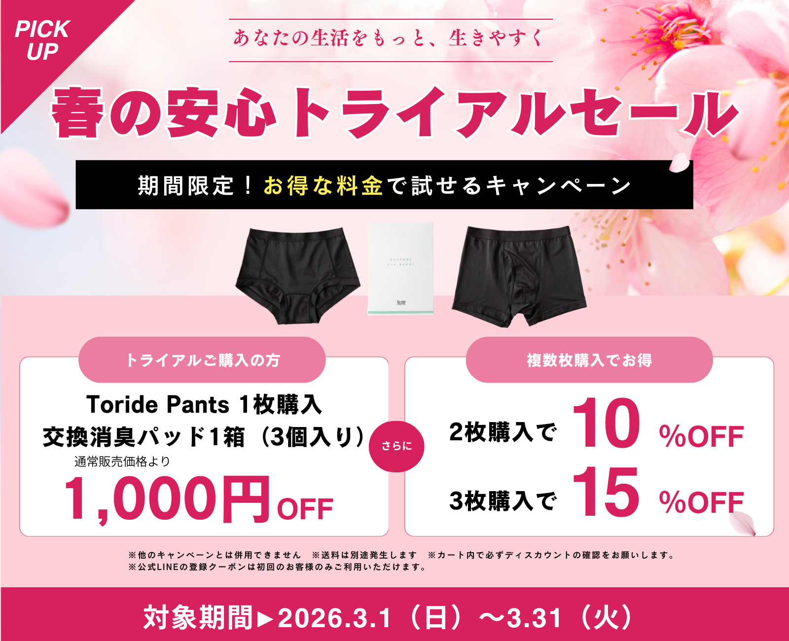\3月限定!春の安心トライアルセール開催🌸/新生活に向けて、トリデパンツが1,000円OFF!さらに買えば買うほどお得な1ヶ月です。📅 期間:2026.3.1 (日) 〜 3.31 (火)💰 特典1:本体1枚 1,000円引き通常価格:6,000円 ⇒5,000円💰 特典2:複数枚購入でさらにお得2枚で10%OFFセール価格:5,000円 ⇒ 4,500円※1枚あたり3枚で15%OFFセール価格:5,000円 ⇒ 4,250円※1枚あたり※他のキャンペーンとは併用不可新生活のスタート!「気付かれたらどうしよう…」というストレスから解放されて、最高の春をスタートさせましょう!